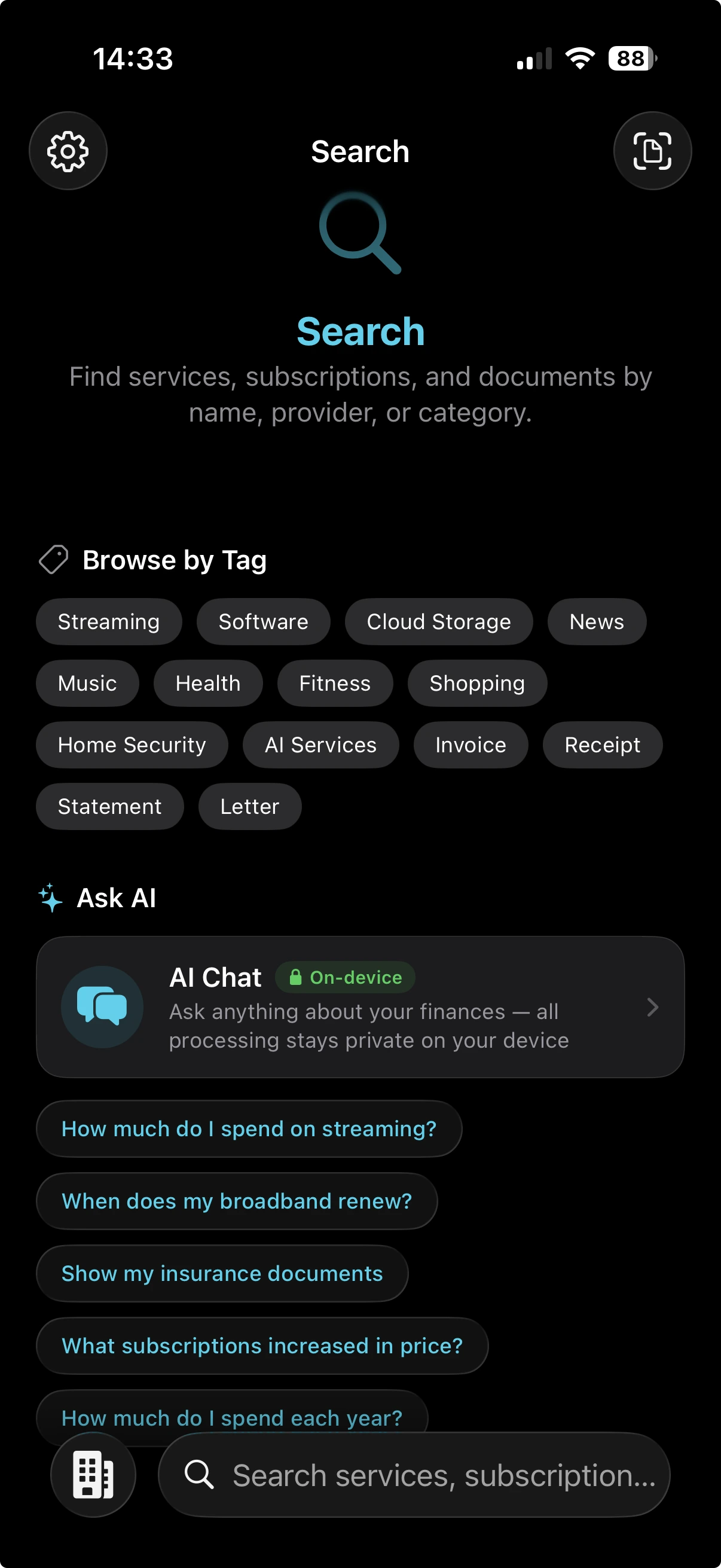 Point the camera at an invoice, receipt, contract, or policy. Folio reads it on-device, extracts the provider, amount, date, and category, and files it where it belongs — no typing required.