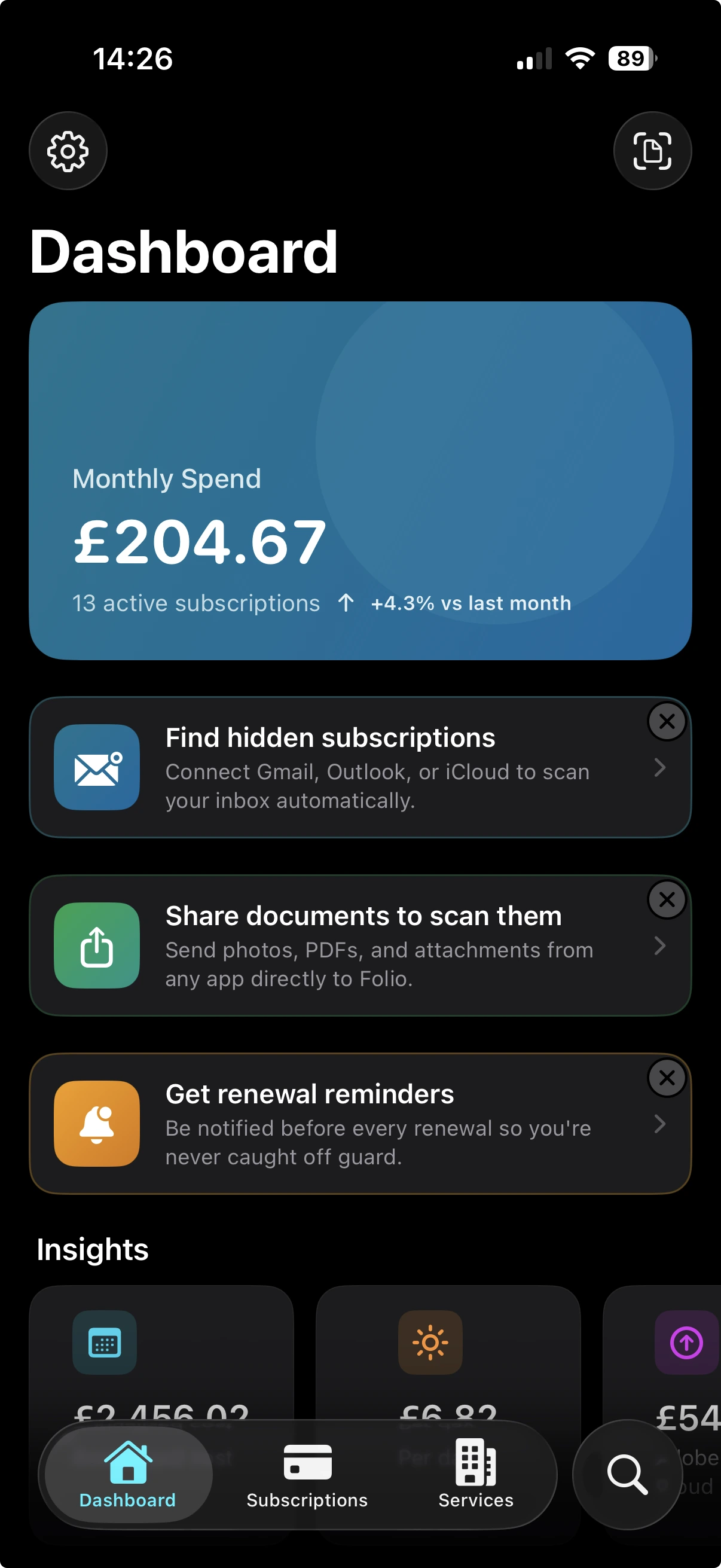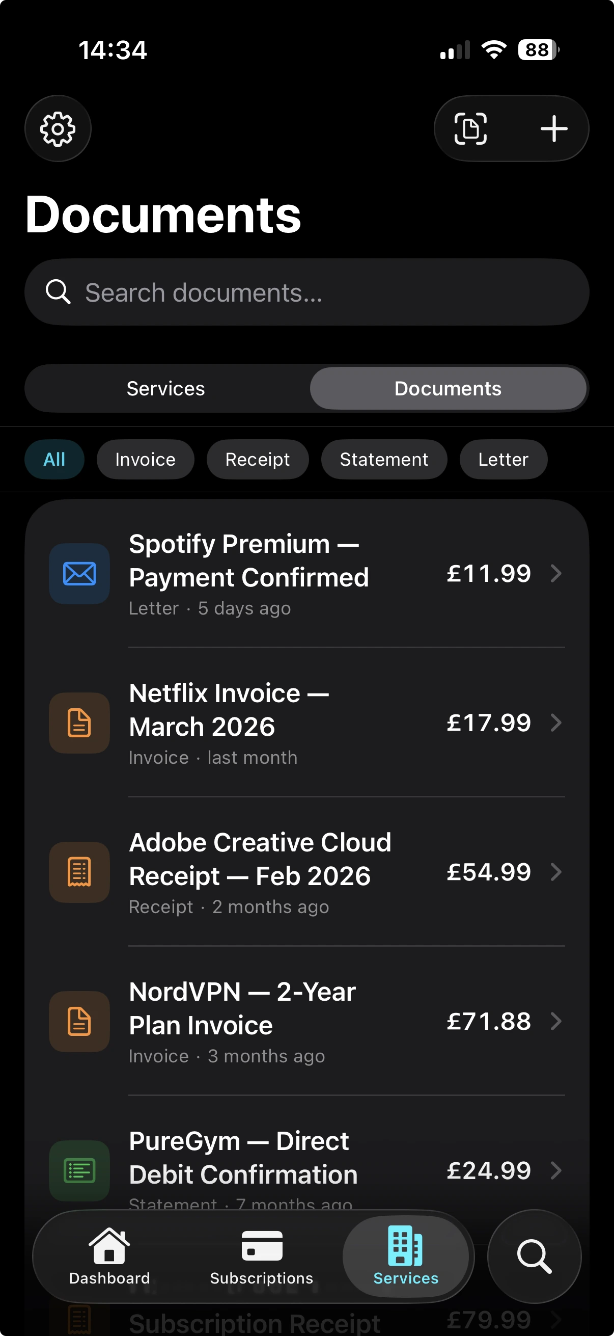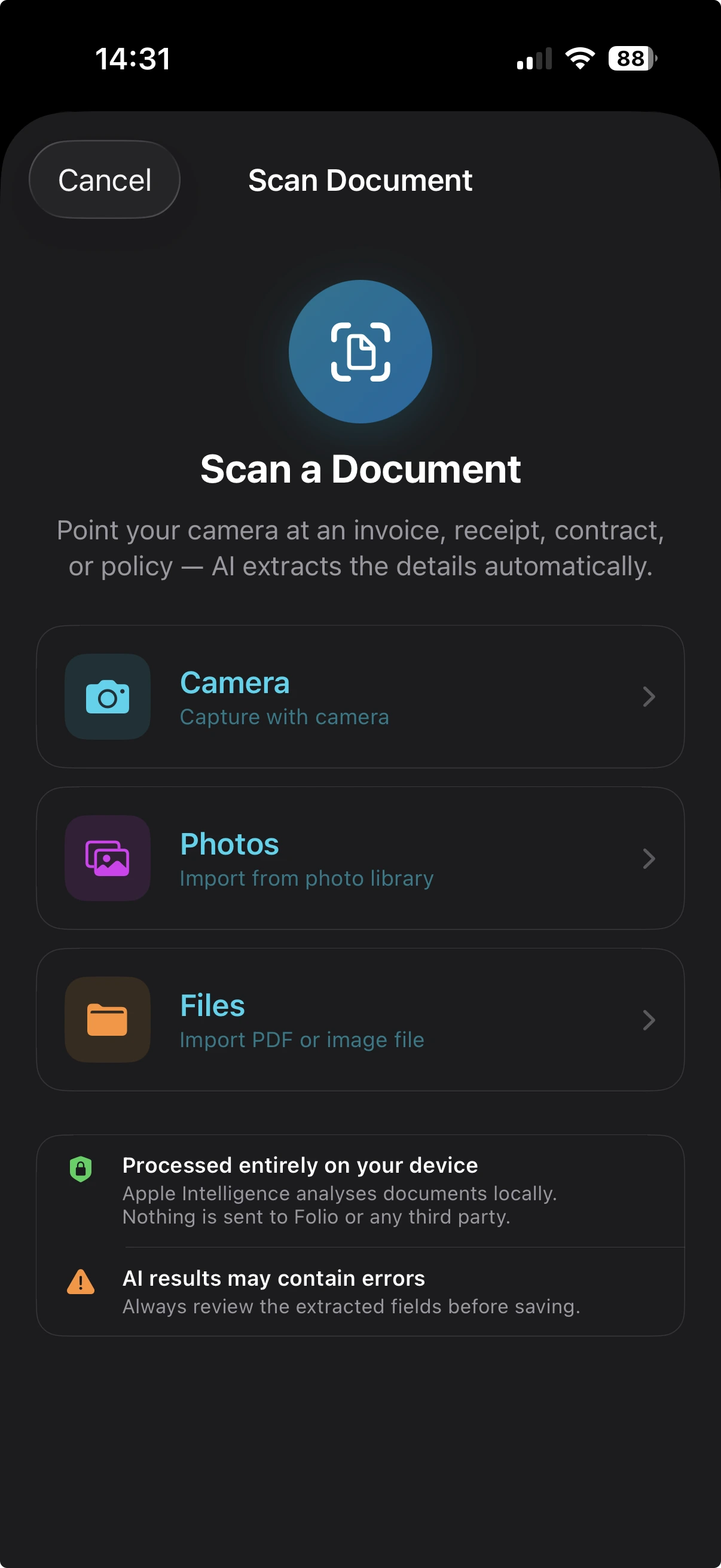 Point the camera at an invoice, receipt, contract, or policy. Folio reads it on-device, extracts the provider, amount, date, and category, and files it where it belongs — no typing required.